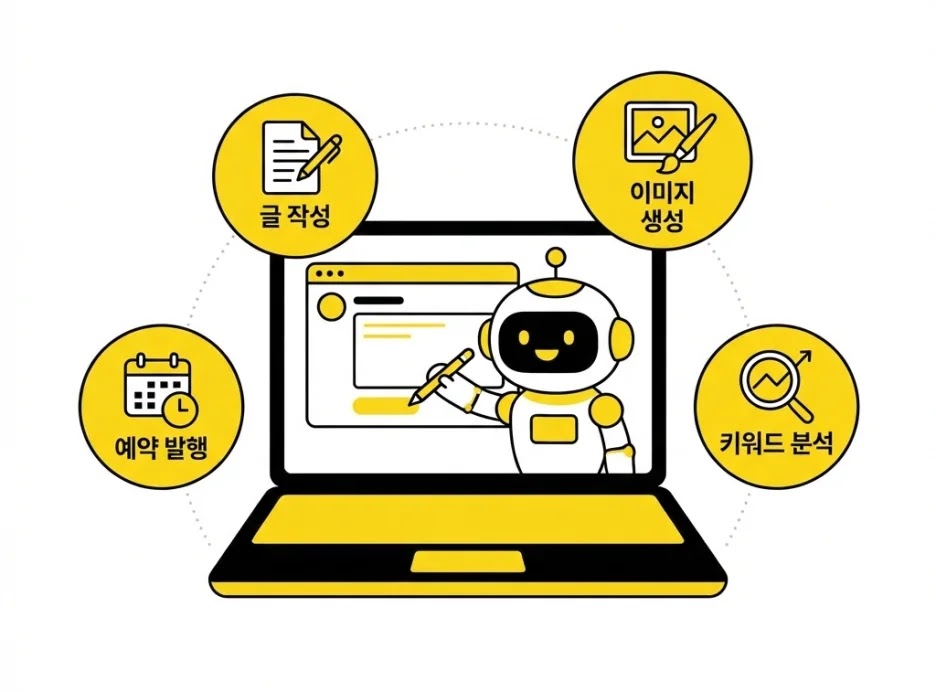 블로그 자동화란 글 작성에서 발행까지의 전체 과정을 AI와 자동화 도구로 효율적으로 처리하는 걸 말해요. 단순히 AI가 글을 대신 써주는 것에서 그치지 않아요. 키워드 분석, 글 구조 설계, 이미지 생성, SEO 최적화, 예약 발행까지 전체 워크플로우를 하나로 연결하는 개념이에요.
